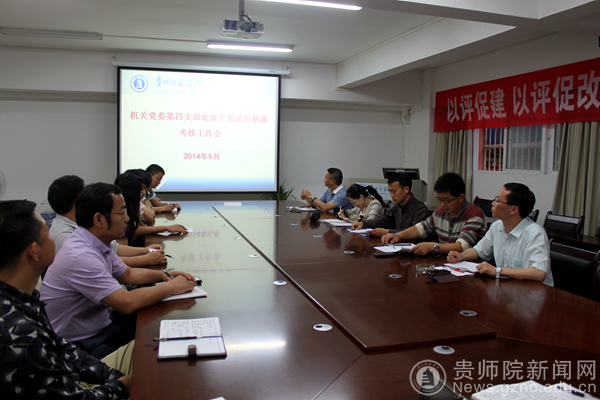 2014年6月2日上午10点,机关党委第四支部在文韬苑教务处会议室召开了2014年处级干部试用期满考核工作会。第四考核组组长方尚礼,组员聂强、万峥,教务处、教学质量监测与评估办公室、招生就业指导处、教学实验管理中心领导及全体工作人员参加会议,会议由教务处处长熊世桓主持。