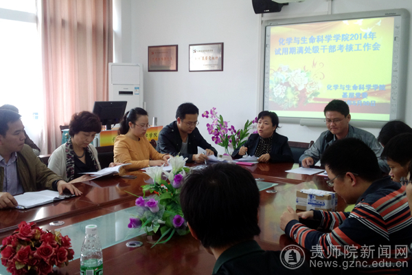 5月30下午1点,化生学院在宁静楼535会议室召开了“贵州师范学院2014年试用期满处级干部考核工作会”,会议由化生学院党委书记韩宝银主持,第七考核组组长王平瑞做了重要讲话,第七考核组组员张静、汤仕波、化生学院院长王超英、副书记干正洋、副院长任翠娟及51名教职员工参加了会议。