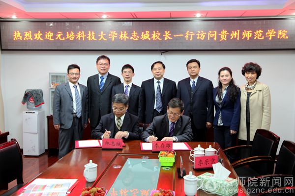 林志城校长对李校长的接待表示感谢,并介绍了元培科技大学的教学、产学研结合、国际交流等基本情况,认为两校在生物制药、环境卫生、管理、旅游等专业的互补与合作空间很大,希望两校能够开展交流合作,相互促进。会后,两校签订了《贵州师范学院 元培科技大学合作协议》。