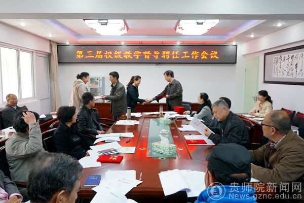 会议首先由校长助理夏卫东解读《贵州师范学院督导规程》,然后由校领导代表学校给各位督导老师颁发聘书,最后督导组成员做了交流发言并由质评办主任邓琴对具体督导工作做出安排。