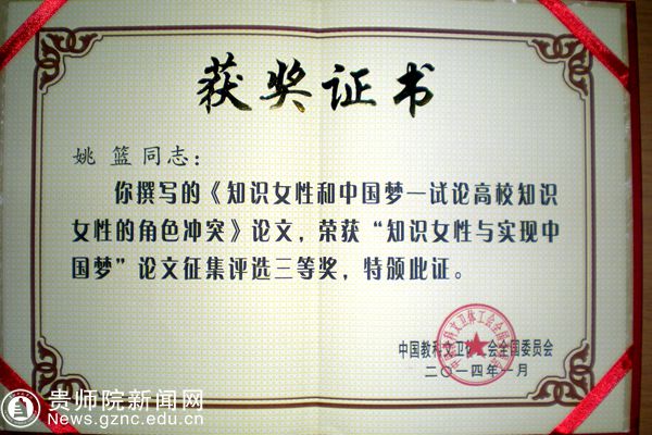 近日,在中国教科文卫体工会女职工委员会开展“知识女性与实现中国梦”论文征集评选活动中,发展规划处副处长姚篮提交的《知识女性和中国梦—试论高校知识女性的角色冲突》荣获三等奖。姚篮老师是此次评选活动中我省唯一一个获得三等奖以上奖项的获得者。