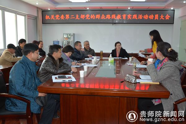 贵州师范学院机关党委第二支部党的群众路线教育实践活动启动大会3月14日下午两点在学校第二会议室顺利召开。本次启动大会参加人员有党政办、发展规划处、对外交流合作处、校友办的全体党员干部、非党员的处级干部、群众代表。学校党的群众路线教育实践活动办公室督导组第三组组长蒋定举组织委员、楚亚萍同志出席本次会议。