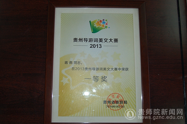 我校地理与旅游学院11级旅游管理本科(一)班学生蒋燕,于2013年11月在学院团委组织下,参加了2013年度贵州省导游词美文大赛,在李乐京老师和白雪老师的指导下,荣获全省导游词美文大赛一等奖。2014年1月23日,蒋燕同学受邀参加2014年全省旅游工作会议,受到专门表彰。
