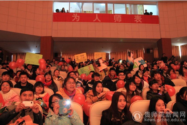 继“花样年华”组的决赛之后,“七彩年华”组和“金色年华”组的决赛将整个大赛推向了高潮。参赛老师们高度重视本次比赛并精心准备。教科院王祥老师演唱的《渡情》,男女声混合表演、搞笑的伴舞引爆了全场;艺术学院的辛力强老师自弹自唱的《传奇》让台下全场的观众们也不禁放声附和,唱响了整个演播厅;阵容强大的“亲友团”,不断的献花、助阵口号声,给台上的老师带来很大的鼓励,使选手们发挥出最佳水平。