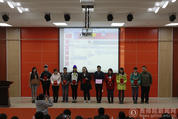 2013年12月9日下午,我校广播电台、大学生记者团联合举办的“贵州师范学院广播电台、大学生记者团挂牌仪式暨2013——2014年度表彰大会”在文韬苑学术讲堂进行。校党委宣传部部长邹晓青、副部长孙秀华、宣传部相关指导老师出席本次仪式,校园广播电台、大学生记者团全体成员到场参加仪式。