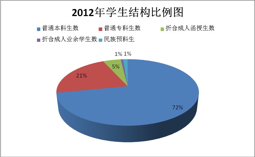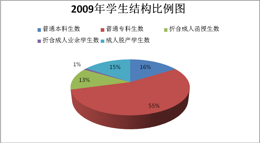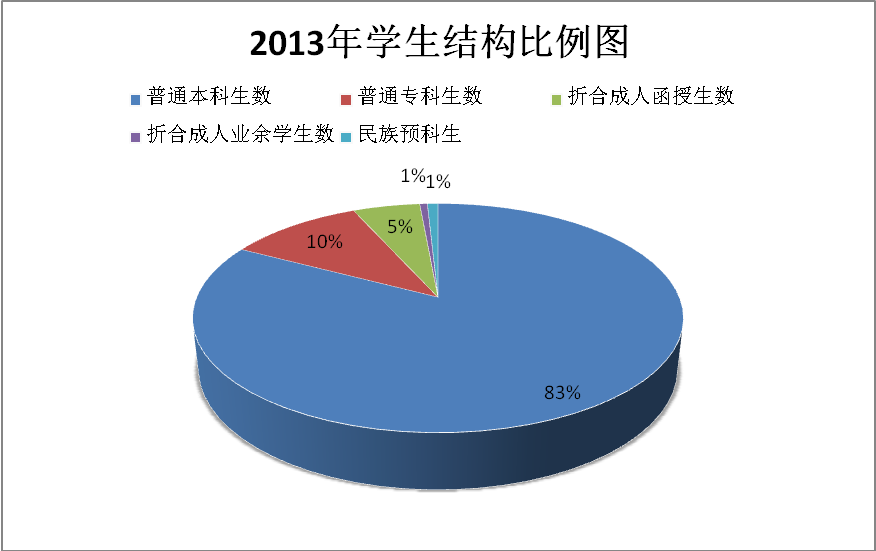 在校生结构是指普通本专科生、折合成人函授本专科生学生数(成人函授本专科生学生总数按10%比例计算)、折合成人业余学生数(成人业余学生总数按30%比例计算)、成人脱产班学生数、预科生数、自考助学班学生数等。其中,普通本科生及研究生占折合在校学生数的比例越大,在校生结构越合理。我校暂时没有研究生培养,所以普通本科生人数占的比例是衡量在校生结构是否符合普通本科院校办学要求的重要指标。2009年,我校普通本科生为1322人,普通专科生为4495人,折合成人函授学生为1044人,折合成人业余本科生为82人,成人脱产班学生为1278人,在校生总人数为8221人,其中普通本科生占折合在校生总人数的比例为16%;2010年,我校普通本科生为3400人,普通专科生为5861人,折合成人函授学生924人,折合成人业余学生122人,成人脱产班学生672人,预科生74人,自考助学班56人,在校学生总人数为11109人,其中普通本科生占折合在校生总人数的比例为31%;2011年,我校普通本科生为6341人,普通专科为4495人,折合成人函授本专科生为548人,折合成人业余学生20人,成人脱产班学生76人,民族预科生131人,在校生总人数为11611人,其中普通本科生数占折合在校生总人数的比例为54%;2012年,我校普通本科生9555人,普通专科生2847人,折合成人函授在校生646人,折合成人业余学生86人,民族预科生164人,在校生总人数为13298人,其中普通本科生占折合在校生总人数的比例为72%;2013年,普通本科生为11342人,普通专科生为1447人,折合成人函授学生为721人,折合成人业余学生82人,民族预科生114人,在校学生总人数为13706人,其中普通本科生占折合在校生总人数的比例为83%。我校以上各年度学生构成比见图13、14、15、16、17。