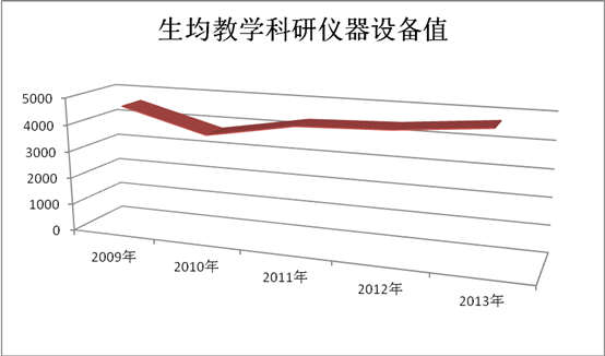 生均教学科研仪器设备值是衡量学校办学条件,学校内部教学科研资源建设和资源构成的重要指标。教育部规定高校合格办学条件的生均教学科研仪器设备值为5000元,限制招生均教学科研仪器设备值为3000元。我校经过五年的投入和建设,生均教学科研仪器设备值除2010年由于在校生规模急剧增加而有所波动外,保持了稳步增长的态势。2009年,由于学校投入的数额大,学生基数相对少,生均教学科研仪器设备值为4631元;2010年,我校折合在校生人数暴增35.13%,而当年新增教学科研仪器设备值只有400.28万元,导致我校生均教学科研仪器设备值急降为3787.44元;2011年,我校生均教学科研仪器设备值明显提高,当年生均教学科研仪器设备值为4342.61元;2012年,我校生均教学科研仪器设备值为4452.81元;2013年,我校生均教学科研仪器设备值为4748.71元。以目前我校教学科研仪器设备建设速度和学生规模来看,2014年我校完全能达到或超过教育部生均教学科研仪器设备值合格指标,为2015的本科教学工作合格评估奠定坚实基础。贵州师范学院年度生均教学科研仪器设备值变化见图11。