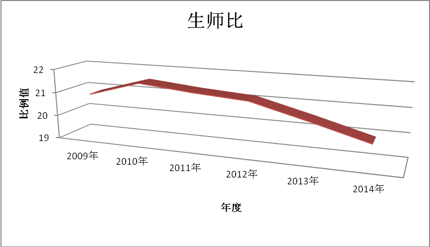 学校2009年从成人院校转制为普通本科院校以来,专任教师数量不足与在校生规模不断增长的矛盾十分突出的情况正在得到有效改善。根据“高基报表”数据,我校2009年的生师比为20.87;2010年的生师比为21.52;2011年为21.30;2012年的生师比为21.14;2013年的生生比为20.54。以目前我校专任教师发展速度和学生规模来看,2014年我校师生比就能完全达到或超过教育部合格办学条件的生师比系数,为2015的本科教学工作合格评估奠定坚实基础。贵州师范学院年度生师比系数变化见图9。