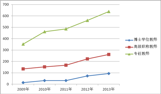 学校党委行政高度重视教师队伍建设,近年来不断加大对高层次人才引进和培养力度,专任教师不仅数量上有较大增长,结构和层次也得到了明显的改善和提高。根据“高基报表”数据,2009年,我校有专任教师353人,具有博士学位的教师14人,高级职称的教师135人。到2013年,我校有专任教师638人,具有博士学位的教师已达93人,高级职称教师262人。其中,2010年,我校具有博士学位的教师32人,高级职称教师152人,专任教师462人;2011年,我校具有博士学位的教师32人,高级职称教师167人,专任教师486人;2012年,我校具有博士学位的教师73人,高级职称222人,专任教师560人。博士学位教师、高级职称教师、专任教师变化见图5。