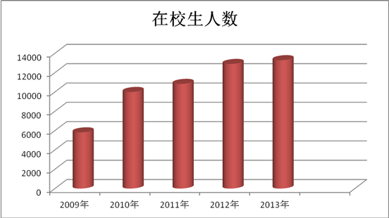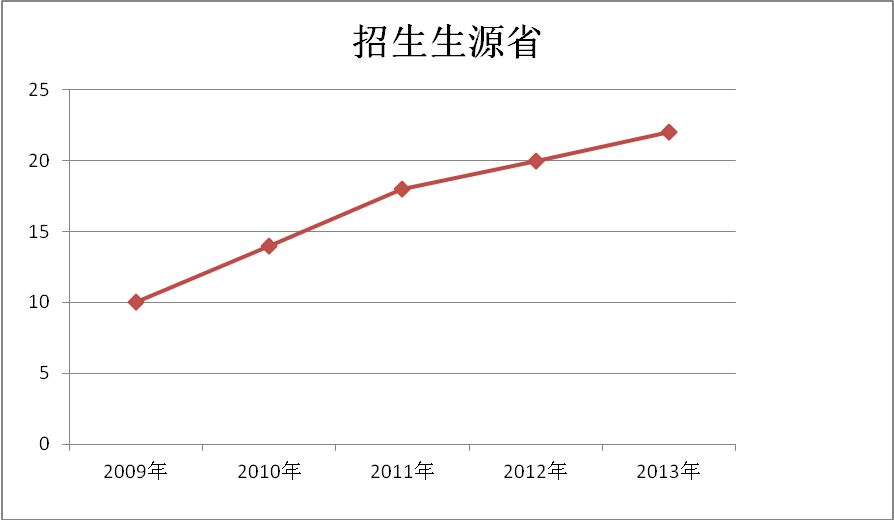 根据近年来“高基报表”统计,我校2009年普通本专科生生源省份为10个,普通本专科在校人数为5817人;2010普通本专科生生源省份为14个,普通本专科在校人数为9261人;2011年普通本专科生生源省份为18个,普通本专科在校人数为10836人;2012年普通本专科生生源省份为20个,普通本专科在校人数为12402人;2013年普通本专科生生源省份为22个,普通本专科在校人数为12789人。 贵州师范学院招生生源省增长趋势(见图2)、贵州师范学院在校生人数增长趋势见图3。