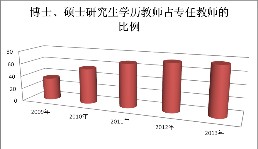 博士、硕士研究生学历教师占专任教师中所占比例是衡量学校教师队伍结构优化的重要指标。我校自2009年以来,加大对高学历人才的引进和培养,博士、硕士研究生学历教师在我校专任教师中所占比率逐年上升,展现了我校走内涵发展道路的巨大成果。我校2009年,博士、硕士研究生学历教师占专任教师总人数的34.8%,而到了2013年,博士、硕士研究生学历教师就占专任教师总人数的72.10%。其中,2010年,为50.64%;2011年,为63.17%;2012年,为71.17%。贵州师范学院年度博士、硕士研究生学历教师占专任教师比例变化见图10。