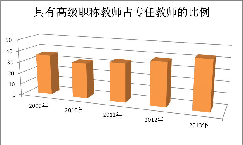 专任教师是学校教学和科研的骨干,除了学历结构是衡量高校教师队伍建设情况的指标外,职称结构也是判断高校师资队伍建设情况的重要指标。教育部检测高校办学条件的指标中,要求具有高级职务教师占专任教师的比例要达到30%及以上方视为达到合格办学条件。我校具有高级职务教师占专任教师的比例自2010年后开始平稳增长,逐步趋于合理。我校具有高级职务教师占专任教师的比例,2009年为35.7%;2010年,由于开始大力引进各类人才,教师队伍数量增加较多,而高级职称教师人数增加相对较少,导致高级职务教师占专任教师的比例为29.87%。此后,我校高级职务教师占专任教师的比例就表现为平稳增长的趋势,特别是2012年以后,学校大力引进高层次人才,使得我校教师队伍职称结构合理化进程明显加快。2011年,我校高级职务教师占专任教师的比例为31.48%;2012年,我校高级职务教师占专任教师的比例为35.77%;2013年,我校高级职务教师占专任教师的比例为41.06%。贵州师范学院年度高级职务教师占专任教师的比例见图12。