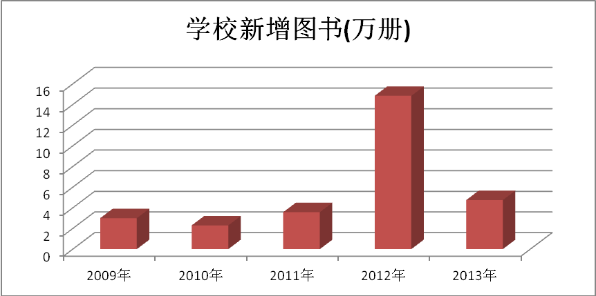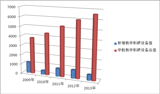 学校改制以来一直致力于改善办学条件,购置和完善教学科研设备。近年来,学校在中央及省相关部门的支持下,对教学科研设备加大了投入力度,逐步改变了学校改制前相对薄弱的教学科研状况,硬件条件得到了根本性改善,初步向现代教学科研设备平台迈进。2009年,学校教学科研仪器设备就投入了1152余万元,教学科研仪器设备总值达3807余万元;2010年后稳步增长,2010年学校教学科研设备新增投资400余万元,教学科研仪器设备总值为4207余万元;2011年,学校教学科研设备新增投资834余万元,教学科研仪器设备总值为5042余万元;2012年,学校教学科研设备新增投资879余万元,教学科研仪器设备总值为5921余万元;2013年,学校教学科研设备新增投资586余万元,学校教学科研仪器设备总值为6507余万元。学校新增教学科研设备值与教学科研设备总值趋势见图4。