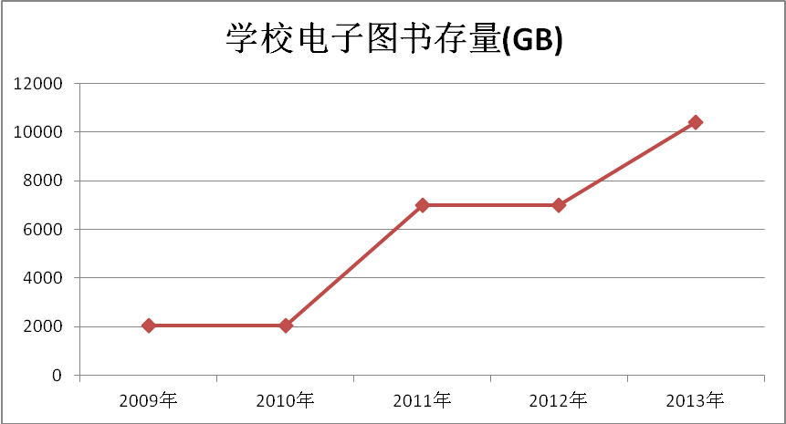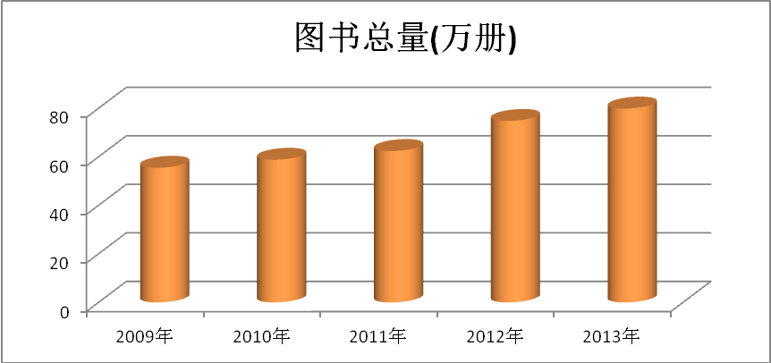 我校从成人高校改制成为普遍本科院校后,为了广大师生科研、教学、学习提供更多、更丰富的资料,加强图书采购、编制、管理工作。图书总数量每年递增发展,种类也日趋完备。2009年,学校图书53.5万册,电子图书存储单位2048GB。到2013年,图书总量就达78.92万册,电子图书存储单位10416GB。其中,2010年,学校新增图书2.3万册,总图书55.8万册,电子图书存储单位2048GB;2011年,学校新增图书3.58万册,总图书59.38万册,电子图书存储单位7000GB; 2012年,新增图书14.85万册,图书总量73.82万册。贵州师范学院年度新增图书数变化见图6、贵州师范学院年度图书总量变化见图7、贵州师范学院年度电子图书存量数变化见图8。