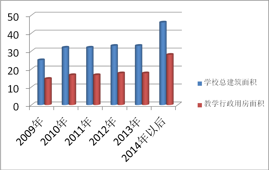 根据“高基报表”统计,我校2009年底学校的建筑面积为25万平方米,其中教学行政用房14.6万平方米;到2012年,学校建筑面积就达33万平方米,其中教学行政用房17.7万平方米;根据在建建筑面积估算,2015年前学校建筑面积将达到46余万平方米,其中教学行政用房为28万平方米,办学用房将极大改善。学校建筑面积增长趋势见图1。