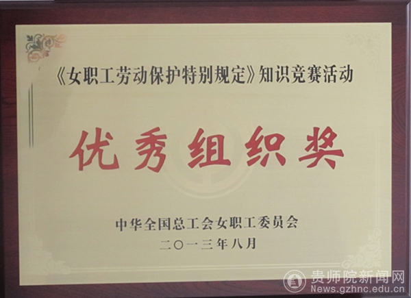为进一步保障女职工权益法律法规的学习和普及,中华全国总工会女职工委员会组织开展了《女职工劳动保护特别规定》知识竞赛活动。在此次活动中,校工会女职工委员会精心组织,广泛宣传,注重实效,荣获优秀组织奖,是贵州省教育系统唯一获此殊荣的单位。