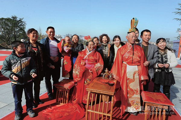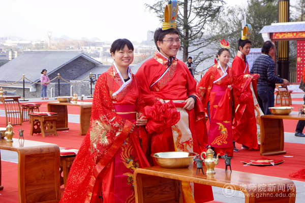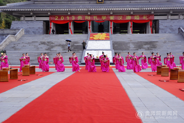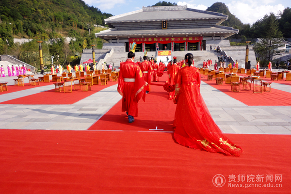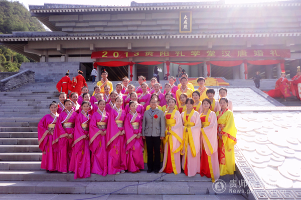 11月24日上午,一场以“天长地久,百年好合”为主题的汉唐集体婚礼在贵阳孔学堂大成殿举行。我校工会常务副主席许丽君同志率队参加了集体婚礼,学校有4对新人和42名学生参加了此次活动。