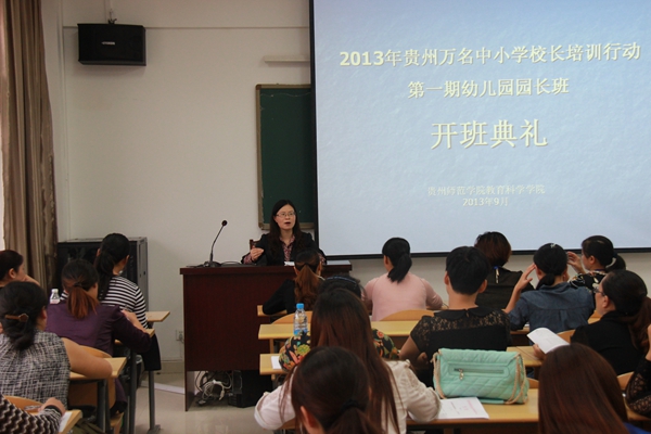 近日,“信合情•同心梦——贵州万名农村中小学校长培训行动项目”开班典礼在贵州师范学院宁静楼150室隆重开班。教育科学学院院长郭文教授、教育科学学院党总支书记彭祥友、教育科学学院教育学教研室主任李建年副教授,及全省各地区58名幼儿园园长参加了此次培训活动,开班典礼由班主任傅小芳老师主持。
