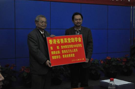 2012年11月3日下午,我校在第一会议室隆重举行香港省善真堂助学金捐赠仪式。出席活动的领导和嘉宾有中央人民政府驻香港特别行政区联络办公室协调部处长褚有奇、省教育厅学生资助管理办公室副主任陈净、香港省善真堂主席黄汉瀚等6人,以及学校副校长石培新、统战部部长赵钢、学生资助管理中心主任王继宁、国际交流合作处赵涛、学工部副部长刘红玲。捐赠仪式由团委副书记韩宝银主持。