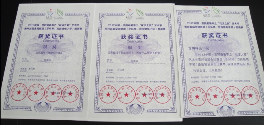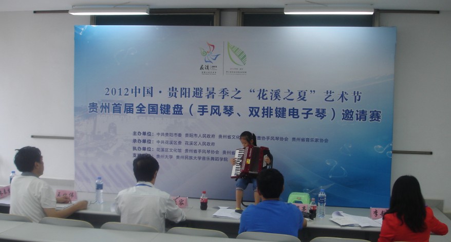 由中国音乐家协会手风琴学会、贵州省文化厅、贵州省音乐家协会于2012年7月26日至29日共同举办的首届全国键盘(手风琴、双排键电子琴)邀请赛在贵阳市花溪举行,这是我省有史以来举办的级别最高、专业性最强、范围最广的全国性键盘大赛,有来自俄罗斯、新西兰、日本等国际著名的演奏家,也有国内的中央音乐学院、中国音乐学院、西安音乐学院、天津音乐学院、四川音乐学院、解放军艺术学院、上海师范大学音乐学院等30多家音乐学院及高师院校的专家及选手。贵州师范学院应邀参加了此次盛会,担任贵州师范学院展演节目的艺术指导有副校长石培新教授、艺术学院蒋英院长、省管专家王化伟教授、文庆容教授及刘临洪老师,王化伟及文庆容两位教授受邀担任这次大赛的评委。