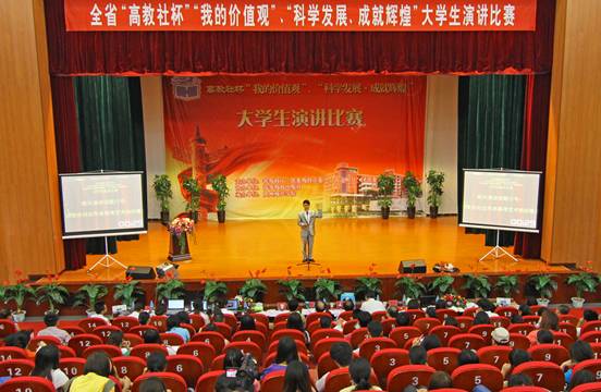 由省教育厅(省委教育工委)、省文明办、团省委主办,高等教育出版社协办,我校承办的贵州省“高教社杯”、“我的价值观”、“科学发展、成就辉煌”大学生演讲比赛于2012年5月11日在我校逸夫楼演播厅成功举行。