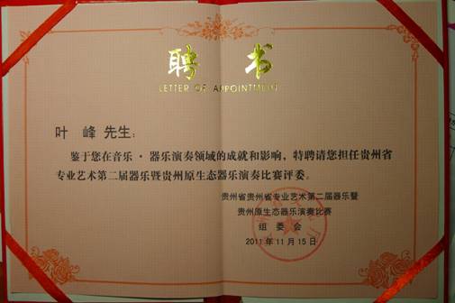 2011年11月21日,贵州省专业艺术第二届器乐暨贵州原生态器乐演奏比赛于在贵州大学艺术学院音乐厅拉开序幕。本次大赛高手云集,均来自全省各艺术院校及专业文艺团体等海选后的演奏员。经过10天的复赛、决赛的角逐于2011年12月1日落下帷幕,颁奖音乐会将于近期举行。我校艺术学院青年古筝教师陈玉莲在本次大赛中荣获二等奖;艺术学院国家一级演奏员叶锋在音乐、器乐演奏领域的成就和影响被聘请为本次大赛评委。 聘书