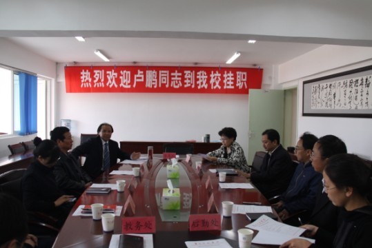 根据省委组织部黔组干函【2011】36号精神,中组部、团中央选派的第12批“博士服务团”成员、同济大学法学院副院长、副教授卢鹏博士挂任我校校长助理。 11月7日,学校于第二会议室举行了简短而热烈的欢迎仪式。校党委副书记、校长韩卉,副校长石培新,纪委书记王德敏出席会议。党政办、组织部、人事处、教务处、后勤处负责人参加欢迎会。校党委副书记万一平主持会议。 会上,万一平副书记宣读了《关于卢鹏同志任职的通知》。韩卉校长对卢鹏博士的到来表示热烈的欢迎,并希望通过卢鹏博士挂职能让学校的开放办学、校际深层次合作与交流等工作得到较大发展。