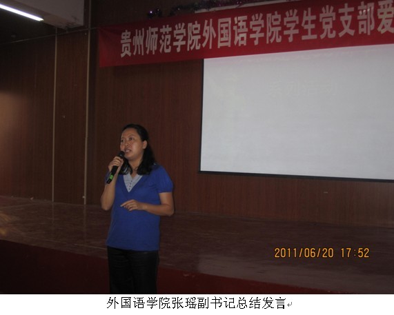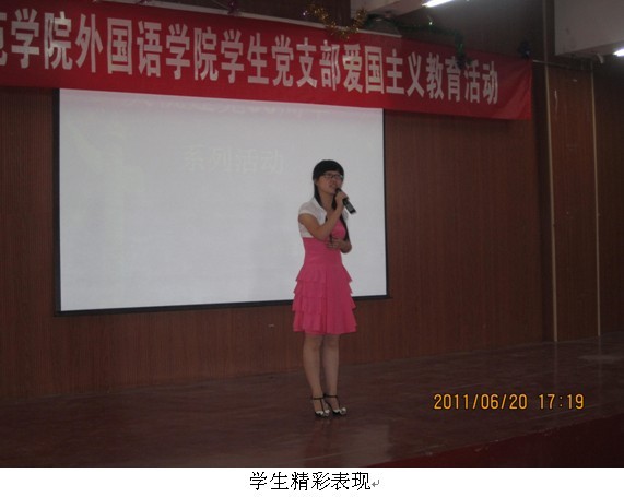 为庆祝中国共产党90华诞,我校外国语学院于2011年6月20日在学术报告厅举办了“感恩党·祝福党”主题演讲比赛。 此次比赛首先在学院各班进行了初选,选出13位表现较突出的同学参加了决赛。决赛当晚,外国语学院党总支副书记张瑶,外国语学院老师罗荣、王声付、叶超群、李明勇作为评委莅临现场,全院所有学生党员和入党积极分子观看了比赛。比赛中,13位选手时而激情澎湃,时而婉约深情,精彩的演讲一次又一次引发了同学们热烈的掌声。最后,张瑶副书记对此次比赛做了点评总结,她说:“选手们演讲的内容丰富新颖,演讲的风格虽各不相同,但都真实抒发了同学们内心深处的爱国爱党情怀,展现了当代大学生党员的风采。”经过两个小时的激烈角逐,最终有6名同学分获了一二三等奖。 通过此次比赛,使同学们深刻认识到了我党的光辉历程,更是激发了同学们的爱国主义热情,达到了良好的爱国主义教育效果。