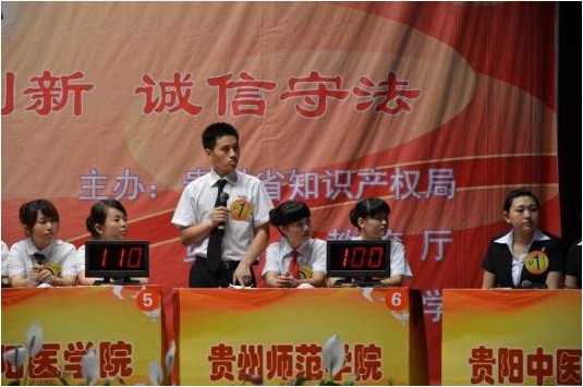 为普及知识产权知识,提高高校大学生知识产权意识,贵州省知识产权局、贵州省教育厅本着“尊重知识,崇尚创新,诚信守法”的精神在贵州师范大学大礼堂举办了“2011年贵州省直高校知识产权知识竞赛”活动,由我校电子设计与人工智能协会的阴华波等三位同学代表学校参加了此次决赛。 经过2个月的初赛,贵州大学、贵州师范大学、贵州财经学院、贵阳医学院、贵阳中医学院、贵州师范学院、贵州民族学院、遵义医学院等八支代表队最终走进了决赛。决赛分为个人必答题、集体必答题、抢答题以及风险题四个环节。各个学校代表队激烈的角逐,气氛异常紧张激烈。我校代表队在第一轮处于弱势的情况下连扳两局,最终凭借出色的表现和顽强的精神获得了决赛第四名的好成绩。