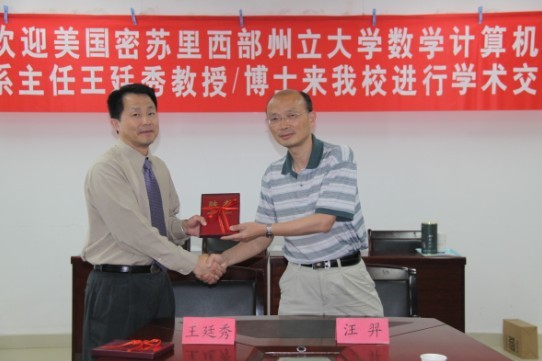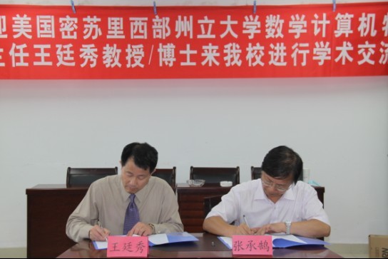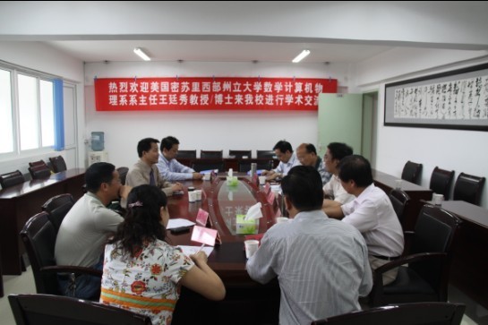 教育部“春晖计划”项目的参与者、美籍华人学者王廷秀博士(美国密苏里西部州立大学数学计算机物理系系主任/教授/博士)于2011年5月6日至11日到我校进行了短期工作访问和学术交流。 5月11日下午3:00,校领导及相关学院、部门负责人在第二会议室会见了美籍华人学者王廷秀博士(美国密苏里西部州立大学数学计算机物理系系主任/教授/博士)。袁惠民书记、汪羿副院长、张承鹄副院长、令狐荣锋副院长与数学与计算机科学学院、物理与电子科学学院、教务处及国际交流合作处负责人参加了会见。 会见由张承鹄副院长主持,袁惠民书记致辞向王廷秀博士来我校进行学术交流表示热烈的欢迎,汪羿副院长就学校基本情况作了简要介绍。数学与计算机科学学院左羽院长及物理与电子科学学院周筑文副院长分别就与王廷秀博士座谈的情况进行了汇报,他们认为与王博士的座谈非常成功且有实效,学习到很多先进的教学及管理经验,将为我校的教学改革及学科建设提供借鉴。同时,两个学院都希望能与王博士在互换青年教师及学生、科研指导以及教学资源共享等方面取得进一步的合作。 会见中,王廷秀博士表示愿意每年短期来我校工作,向学校的教学、科研和管理方面提出意见和建议,当好学校国际化合作项目的参谋。他还提出可以与我校通过访问学习的方式在青年教师培养方面实现合作,也可以选派优秀学生到密苏里西部州立大学进行短期交流学习。他还对我校的发展提出了自己的建议---转变教学和管理的理念,走特色办学道路。最后,校领导对会谈进行了总结并再次感谢王廷秀博士到我校进行学术交流,为我校的发展建言献策。同时,校领导也要求相关学院及部门加强与美国密苏里西部州立大学的联系,争取实现具有实质性学术交流与合作。 会谈结束后,张承鹄副院长代表学校与王廷秀博士签署了校长顾问及数学学科客座教授的协议书,汪羿副院长为王博士颁发了聘书。