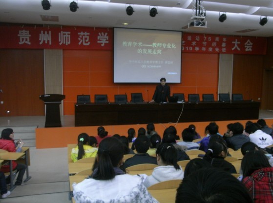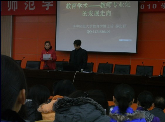 12月9日下午15点整,在我校文韬苑学术讲堂,教育科学学院特邀山东师范大学博士、现在华中师范大学从事博士后研究工作的薛忠祥副教授作“教育学术——教师专业化的发展走向”学术讲座。讲座由教育科学学院副院长刘启艳主持。 薛博士首先介绍了教师职业成为一个专业的几个条件,然后围绕专业化对教师的要求,举了些多生动有趣的教育实例。同学们积极地对教育实例发表自己的看法和观点。薛博士从同学们的观点出发,引导同学们认识到了要做一位专业化的教师,必须从事教育学术研究。薛博士提出:希望同学们在今后的学习中做到四最,即最全面、最深刻、最长远和最先进,努力做一名优秀的人民教师。 最后刘启艳副院长对薛博士的到来表示衷心的感谢,也希望广大同学抓住机遇,在今后的学习和实践中不断提高自身的综合素质,向更加专业化的方向发展,做一个适应社会的有用人才。 教科院领导、教师及各学院学生共200余人参加了此次讲座,讲座在一片热烈的掌声中落下帷幕。