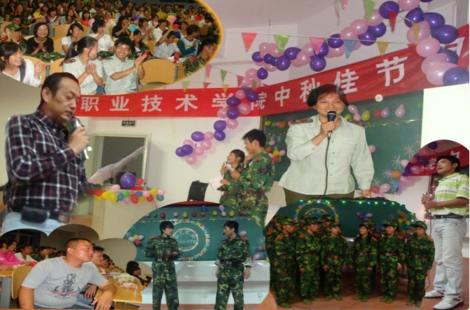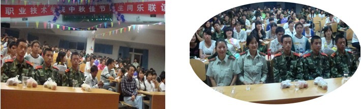 9月22日即农历八月十五晚七时,我校职业技术学院的老师们为了表示对新生的关爱、对远离家乡的教官的慰问,在宁静楼625教室召开了职业技术学院“中秋佳节”师生同乐联谊晚会。晚会上师生欢聚,共度中秋。 职院院长沈明、党总支副书记侯晓薇、辅导员、部分老生参加了这次晚会。晚会以小合唱《军中绿花》拉开帷幕。浓浓的乡情弥漫着整个晚会,老师们的关爱之情却甚过对家的思念之情。一曲曲思乡的歌,一首首想家的诗都让在场的教官、同学们倍感温暖,老师们无私的爱和热情洋溢的话语让大家很是感动。多才多艺的老师和同学们的表演是整场晚会的主题,有趣的游戏互动使整个晚会更加热闹和谐。最后,晚会在合唱《花好月圆》中落下帷幕。