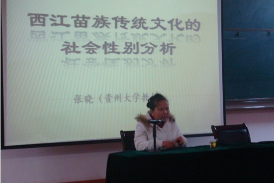 2009年11月26日晚7:00,地理与旅游学院邀请贵州大学人文学院教授、原贵州社会科学院研究员张晓到我校作了题为《西江苗族传统文化的社会性别分析》的学术报告。我校三百多名师生到场聆听了学术讲座。张晓教授是贵州省内知名的人类学专家,在少数民族传统文化和少数民族妇女方面具有较高造诣和成就。 在学术报告中,张晓教授从生计文化层面、制度文化层面和精神文化层面对西江苗族的传统文化进行了深入浅出的分析。张晓教授以其丰富的田野调研知识把一个人类学的新名词“社会性别”从多角度、多层次进行了深入浅出的分析。讲座现场气氛热烈,师生互动非常好。讲座结束后,许多师生积极地与张晓教授进行了现场交流。 讲座激起了师生对我省少数民族文化学习和保护的热情,受到在座师生的一致好评。