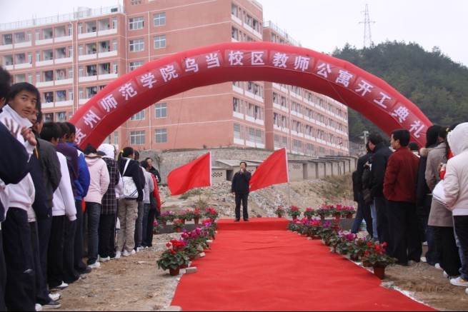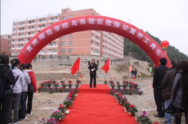 11月17日上午,我校在乌当校区隆重举行学校教师公寓开工典礼。出席开工典礼的领导有:贵阳市政府副秘书长刘继东,省发改委社会发展处处长李薇,省教育厅高教处副处长胡成俊,乌当区政府副区长杨长萍、谢秩刚,省建工集团党委书记、董事长刘建忠,省建工集团总经理陈仕华及我校党委书记霍健康,院长袁惠民,副院长汪羿、纪委书记王德敏,副院长万一平、张承鹄校领导。开工典礼由院长袁惠民主持。校党委书记霍健康、省建工集团党委书记刘建忠分别作了讲话。 霍书记首先代表学校党委、行政和全体师生员工,感谢省委、省政府,贵阳市委、市政府、乌当区委、区政府及有关部门,省建工集团等对我校建设和发展的大力支持。他说,开工建设教师公寓,是我校学习实践科学发展观承诺的实事之一,是学校非常重要的大事。有利于解决学校四百多教职工“走教难”问题,有利于教师安心乐教,有利于学校乌当校区校园安全和学校稳定。2008年省建工集团与我校在各级党委、政府支持下,创造了八个多月建成乌当新校区的奇迹,他希望教师公寓建设工程能再创奇迹,尽早圆上我校广大教职工的“住房梦”。 刘建忠书记表示,将优质、高效地建设贵州师范学院教师公寓,履行社会责任,向贵州师范学院师生交出满意答卷。 随着袁院长宣布“贵州师范学院乌当校区教师公寓正式开工”话音落地后,礼炮声和《今天是个好日子》的奏响,典礼现场顿时热闹沸腾。 参加开工典礼的有全校教职工、学生代表、设计单位代表及施工人员代表。