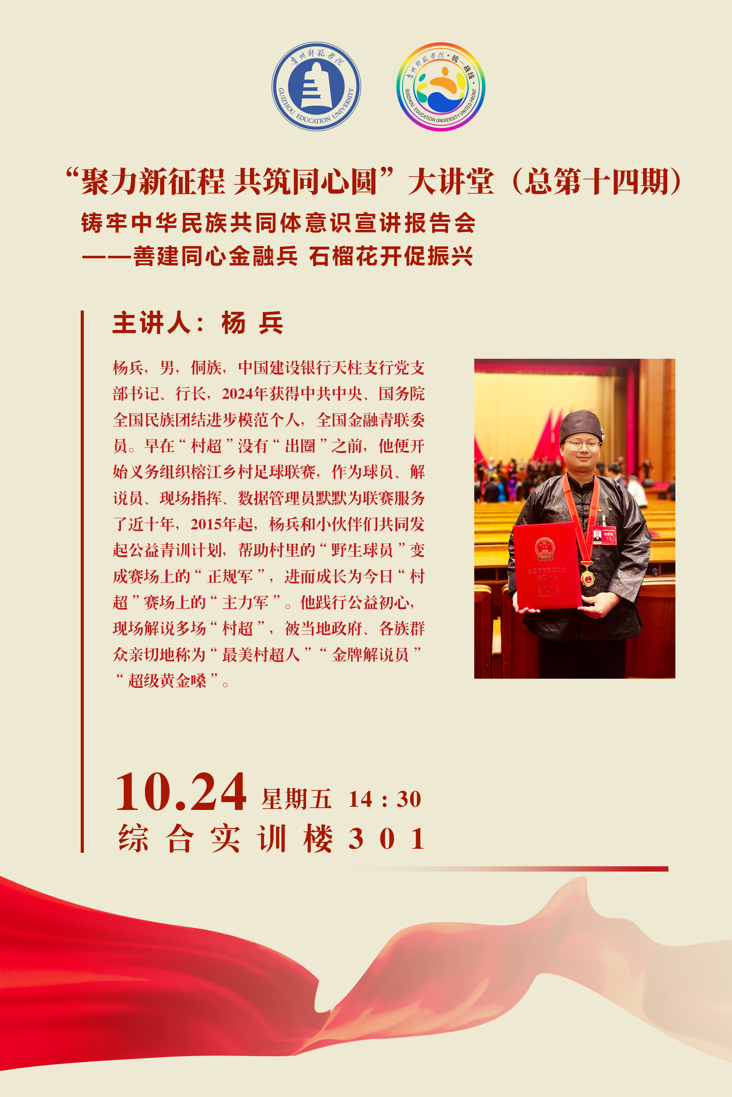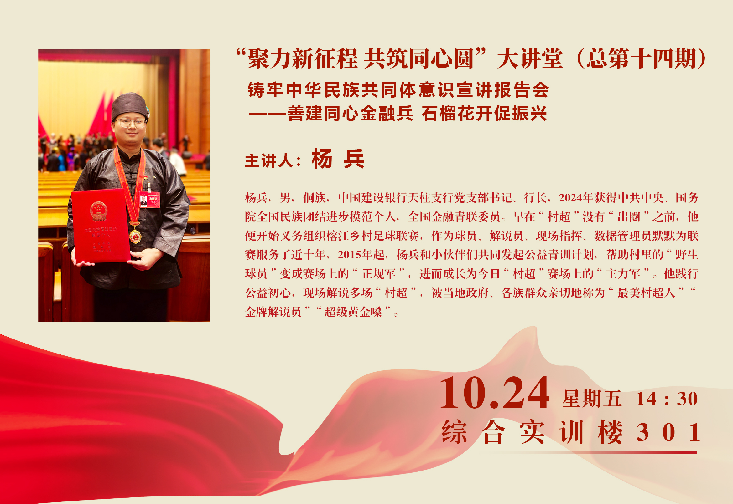 讲座主题:“聚力新征程 共筑同心圆”大讲堂(总第十四期)铸牢中华民族共同体意识宣讲报告会 ——善建同心金融兵 石榴花开促振兴