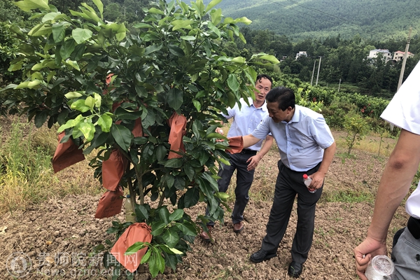 随后,余维祥一行走在产业路上,深入田间地头,实地考察了川岩村红香柚种植基地。他们仔细查看红香柚的长势,并不时询问产销对接、集体经济带动群众务工、老百姓受益等具体情况。