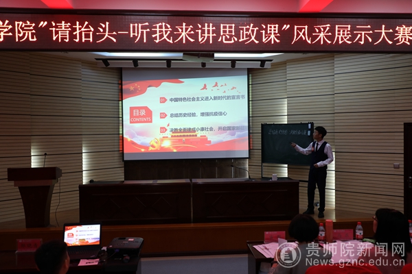 学工部部长刘红玲宣读比赛规则和评分细则。比赛开始后,各团队授课精彩纷呈,形式多样,他们以课程知识点为基,引经据典、谈我国抗击新冠疫情的先进人物事迹,举决战小康的典型案例,积极探索新的教学模式,大胆尝试新的教学方法,他们在PPT讲授、课堂互动中创新性的融入新闻播报、正反辩论小组等模式,呈现出了一场场比较精彩的教学课堂,赢来场下掌声不断。比赛持续了5个多小时,现场气氛活跃热烈。各团队对不同选题多维度、多层面的讲授,展示了我校大学生的理论知识,展示了他们的教学技能,展示了他们的多彩课堂,展示了他们飞扬的青春。他们把“纸上谈”变“实践行”,让思政课有时代性也有感召力,让思政课有“知”也有“味”。