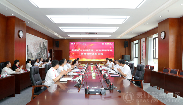 本网讯 为促进馆校合作,实现资源共享,传承优秀传统文化和民族民间文化,彰显贵州文化特色和人文精神,加大文史研究、文艺创作、文化创新力度,推进贵州文史研究与大扶贫、大数据、大生态深度融合,促进贵州经济社会文化发展。6月23日,贵州省文史研究馆与我校在信息楼二楼会议室签订了战略合作协议,省人民政府副省长、党组成员胡忠雄出席签约仪式,省人民政府副秘书长邹康,省委统战部副部长、省文史研究馆党组书记、馆长王茂爱及副馆长杨玉和、曾达,我校校领导全体成员出席,仪式由副校长余维祥主持。