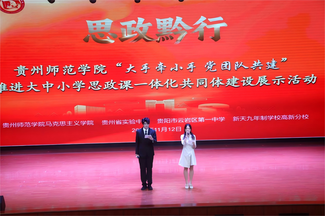 本网讯,为深入学习贯彻习近平总书记关于思政课建设的重要指示精神,落实贵州省委书记徐麟在贵州师范学院调研时对大中小学思政课一体化建设的工作要求,构建党团队一体化育人链条,强化思想政治教育的连续性与系统性,11月12日,贵州师范学院“大手牵小手 党团队共建”推进大中小学思政课一体化共同体建设展示活动在学校演播厅隆重举行。本次活动由贵州师范学院马克思主义学院、贵州省实验中学、贵阳市云岩区第一中学、新天九年制学校高新分校等中小学联合承办。贵州师范学院党委副书记高勇,校党委常委、副校长、马克思主义学院党委书记陈真波,马克思主义学院院长兼党委副书记金凤,音乐舞蹈学院团委书记舒然出席,来自全市十多所大中小学的思政课教师代表、党团辅导员及学生代表共计300余人参与活动。