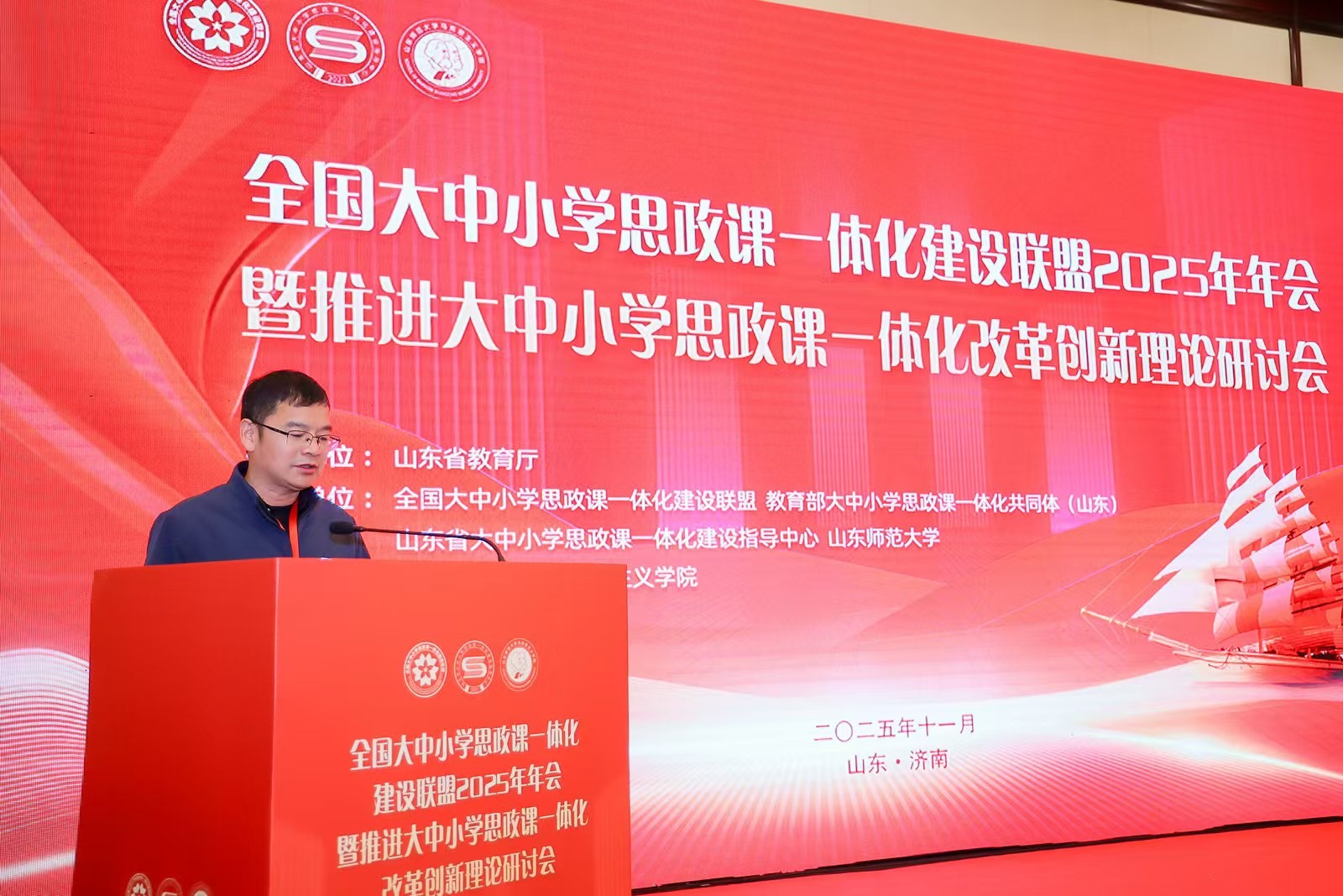 本网讯 2025年11月28日至30日,全国大中小学思政课一体化建设联盟2025年年会暨推进大中小学思政课一体化改革创新理论研讨会在济南召开。本次会议由全国大中小学思政课一体化建设联盟、教育部大中小学思政课一体化共同体(山东)、山东省大中小学思政课一体化建设指导中心、山东师范大学主办,由山东师范大学马克思主义学院承办。来自全国各省市高校250余位学者和研究生参会。校党委常委、副校长、马克思主义学院党委书记陈真波带领马克思主义学院副院长陈祖召和秦月副教授参会。