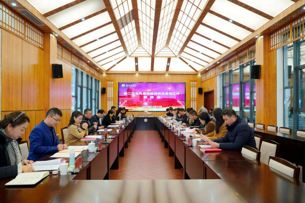 本网讯 为深入学习贯彻习近平总书记关于党的自我革命的重要思想,全面落实二十届中央纪委四次全会、省纪委四次全会精神,一体推进“三不腐”体制机制建设,持续推动学校全面从严治党向纵深发展,12月24日,我校召开2025年第二次党风廉政建设和反腐败工作联席会议。校党委书记战勇出席会议并讲话,会议由校党委常委、纪委书记、监察专员杨璇主持。