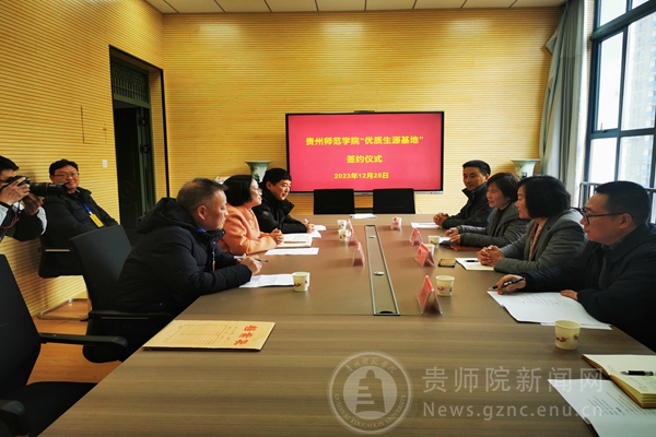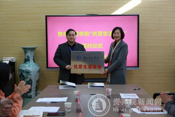 招生就业指导处处长付巧与黔西一中副校长杨程签订“优质生源基地”共建协议并授牌,与会人员共同观看了贵州师范学院宣传片,双方就共建内容进行了充分沟通交流。