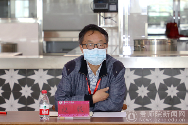 赵毅讲话,感谢乌当区市监局、高新分局领导同志们对我校后勤工作的支持和这段时间为学生返校复课所做工作的付出;他表示,所有食堂从业人员必须做核酸检测,持有效健康证才能上岗,入校通行证以核算检测为基础。