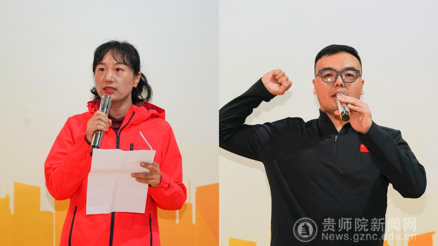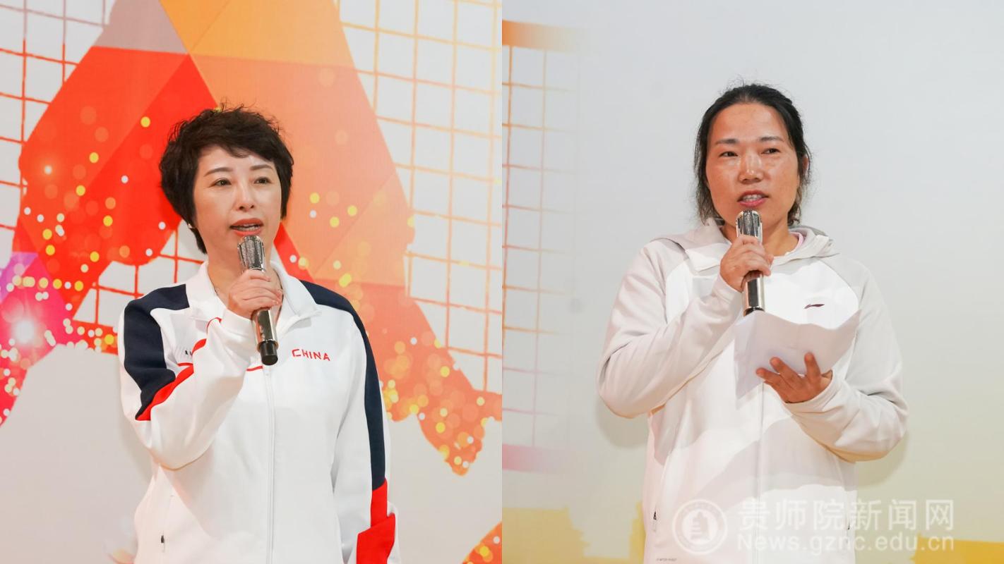 校工会主席刘红玲主持(左图)/体育学院院长邬孟君作比赛规程讲解(右图)
