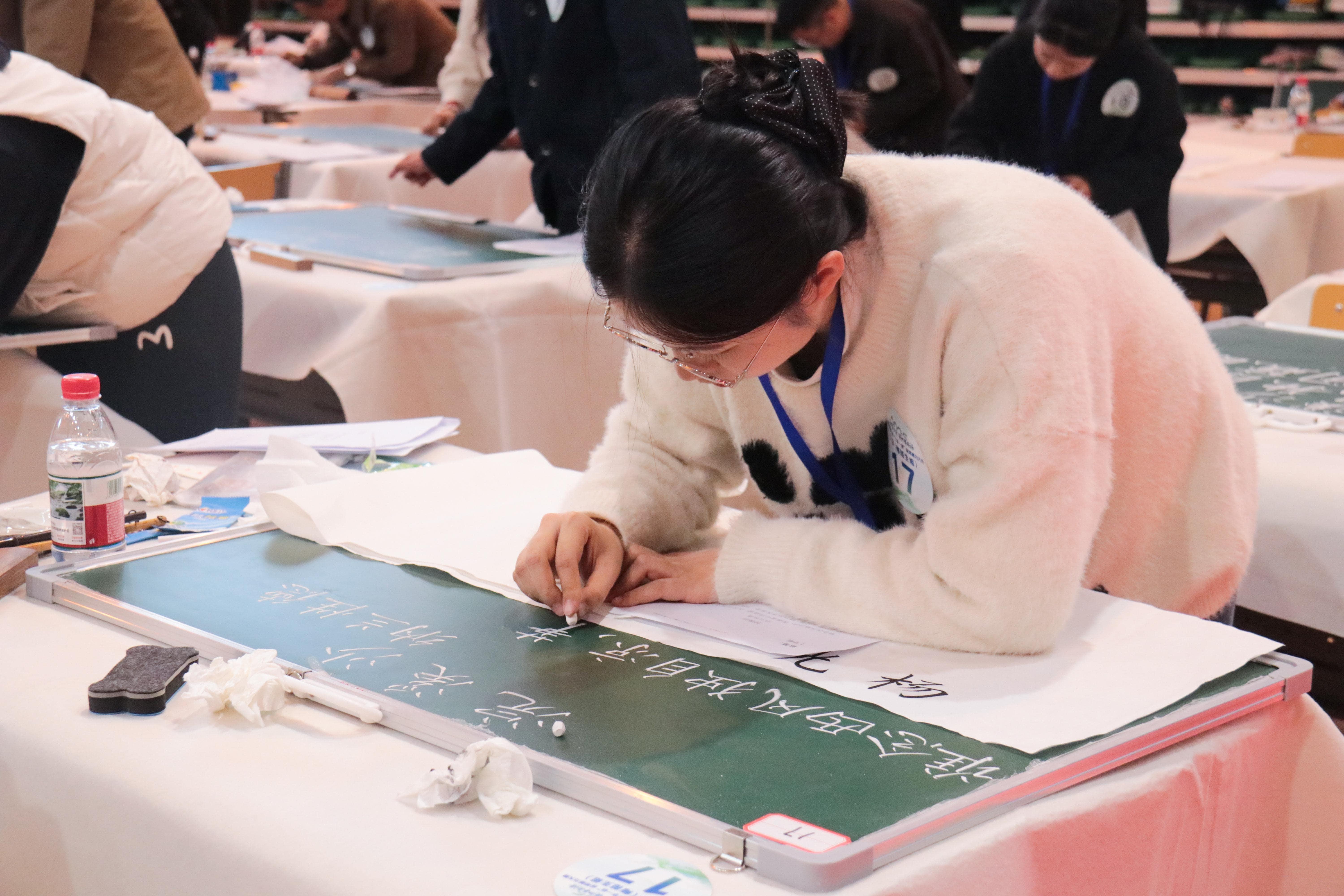 上午的赛场内墨香袅袅,尽显汉字之美。硬笔字环节,选手们笔下的字迹规范工整中透着个性,每一笔都凝聚着平日的书写积淀,横平竖直间是对汉字规范的坚守,撇捺舒展中是个人风格的自然流露;毛笔字赛场古韵盎然,选手们提按顿挫的运笔间,或藏锋敛气显浑厚,或挥毫泼墨见飘逸,一幅幅作品墨色浓淡相宜,行楷的神韵展现得淋漓尽致,让人深切感受到中华书法跨越千年的艺术魅力;粉笔字的比拼则在黑板这方“小天地”里上演。168块黑板上,字迹或清秀如溪,或刚劲似松,白色粉笔在黑板上勾勒出的不仅是工整的笔画,更是教师们和即将走上讲台的师范生们教书育人的赤诚初心。下午举行的“一话”比赛,选手们语音面貌良好,大方自信,作品朗诵做到了字正腔圆、口齿清楚、自然流畅,抑扬顿挫间展现了较高的普通话水平和表现技巧。