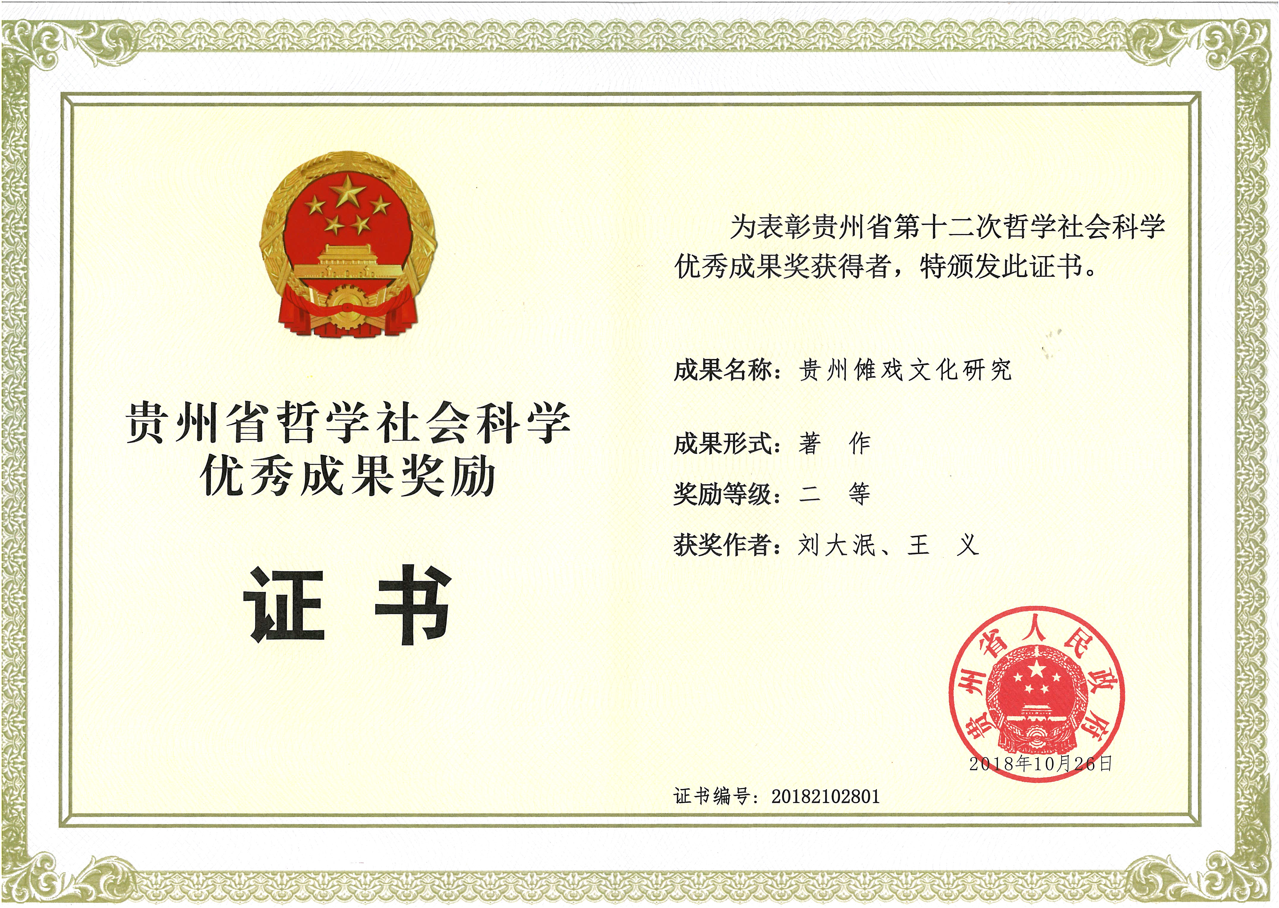 傩戏被誉为中国戏剧的活化石,是非常宝贵的非物质文化遗产。作为贵州知名的文化专家,刘大泯把高原民族文化的大美乐章抒写在多彩贵州的大地上。撰写39万字的《贵州傩戏文化研究》由中国社会科学出版社出版,该书在充分剖析贵州傩戏文化源流的基础上,系统梳理了贵州及周边省区关于傩戏文化研究的文献,将贵州傩戏文化与湖南、四川、广西、云南、重庆等省市的傩戏文化进行了比较研究和中肯深刻的研究述评。得出建立以贵州为中心的傩戏文化带的设想,并就如何建立贵州傩戏文化带提出了可行的对策及建议。书稿公开出版发行后,相继得到了文化界、学术界的高度关注,还入围第十三届中国民间文艺“山花奖”学术著作奖和贵州省社科奖著作类二等奖。