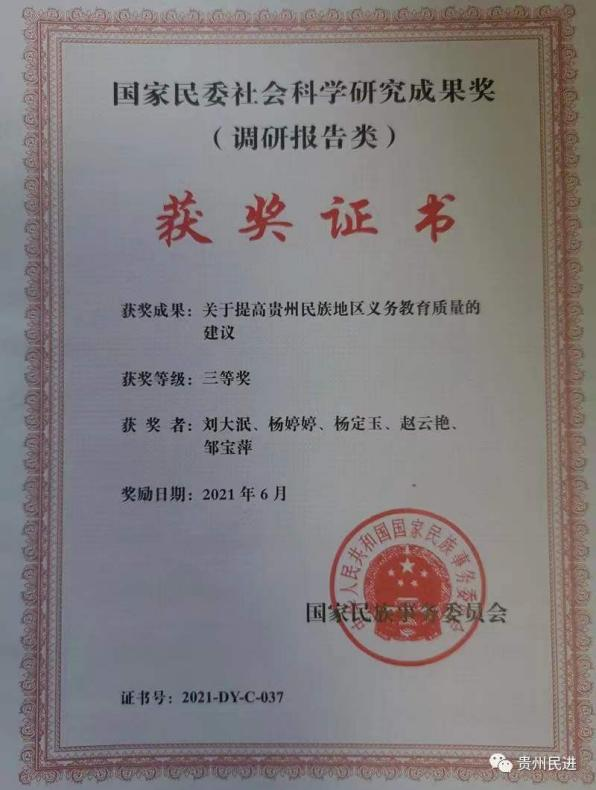 作为学校贵州民族教育研究院院长,刘大泯把民族地区教育发展、乡村振兴和民族文化传承保护同自身研究工作结合,融在学校跨越式发展的沃土里。带领研究院成员与贵州省民族宗教事务委员会共建科研实体机构,本着“创新理论、学术研究、指导实践、服务决策”的学术定位,聚集和培养优秀科研人才进行基础研究和应用研究,积极为国家和地方经济社会发展提供决策咨询服务。撰写的《关于提高贵州民族地区义务教育的建议》研究报告被国家民委评为2021年优秀社科成果三等奖,也是学校近年来第一个国家部委领发的社科奖。撰写的《贵州苗画文化艺术研究》和《中国苗锈艺术研究》两本专著已列入今明两年中国社科出版社的出版计划。主持的《贵州历史大通道与各民族交往融合》和《贵州省少数民族村寨数字化保护》两个项目巳完成中期评估。