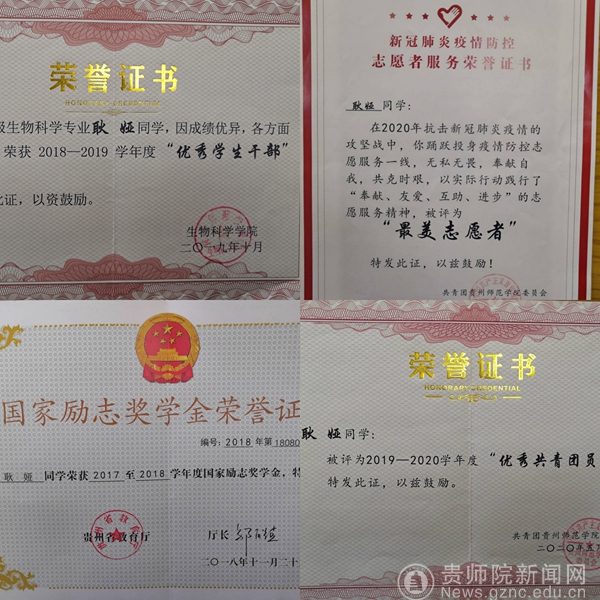 本网讯 耿娅,女,汉族,中共预备党员,贵州威宁人,贵州师范学院生物科学学院2017级生物科学1班学生。在校期间,获得“中国大学生自强之星”奖学金、两次国家励志奖学金和“优秀共青团员”、“优秀学生干部”、“三好学生”等称号。在新冠肺炎疫情防控中荣获校级“最美志愿者”荣誉称号;2018年——2020年,长期担任班级学习委员。荣获2019年度“中国大学生自强之星”奖学金。