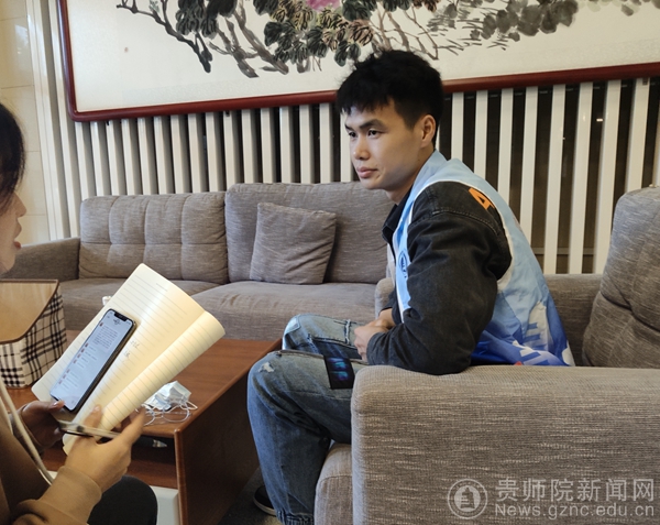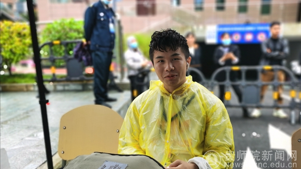 19级体育学院的黄豪在这次迎新工作中负责帮助萌新们搬运行李,持续不断的阴雨使得他的工作更为艰辛,但作为志愿者的他认为,志愿者就是要去帮助那些有需要的人,而今天的萌新,就是他应该去帮助且必须帮助的对象。他说:“今天新入学的学弟学妹们对校园的一切都还很陌生,并且今天还下着雨很不方便,因为疫情的原因家长也不能送自己的孩子进来,我们做为学长帮助他们是应该的”,他用自己的行动传递着师院的温暖情怀。