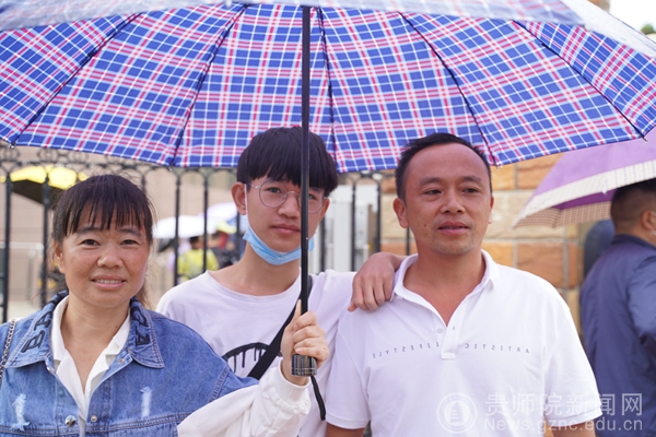 跟父母撑着伞站在校门口等待同伴的雷国付来自旅游与文化学院,他是一个复读生,上一年因为不满意选择的专业而决定再拼搏一年,也终于在这“特殊”的一年被师院录取,选到了自己喜欢的专业,且他的父母也非常支持他的选择,在忙碌的工作中抽出时间陪他来到报道,虽然因为疫情送子只能止于校门口,但他的父母还是很欣慰地说:“以后还有机会的,有机会一定会再来学校看他”。雷国付怀着对父母的感动,搭着他们的肩在师院门口合影留恋,照片中的雷国付眼中满是对大学的期待。